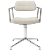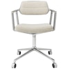 453 Snurrstol med hjul kombinerar en lätt aluminiumram med läderklädsel, vilket skapar en tydlig kontrast mellan industriella och organiska element, stolen är enkel att placera i olika miljöer och fungerar både som arbetsstol och som flexibel sittmöbel i mer öppna arbets- eller vistelseytor, hjulen ger rörelsefrihet medan stolens form säkerställer ett samlat och välbalanserat uttryck.