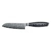 Akio santokukniv 13 cm från Mareld är kniven du sträcker dig efter när du vill arbeta nära och exakt. Den mindre bladlängden ger fantastisk kontroll och gör den perfekt för att hacka örter, skiva grönsaker eller fixa detaljerna i en rätt. Damaskusmönstret i stålet gör varje kniv unik och ger serien sitt karaktäristiska uttryck, medan handtaget i pakkaträ tillför värme och elegans. En liten santoku med stor personlighet – skapad för allt från snabba vardagsmoment till kreativa köksstunder.