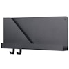 - Hylla med ett grunt hyllplan, fack och två krokar i nederkant.