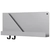 - Hylla med ett grunt hyllplan, fack och två krokar i nederkant.