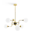 Galassia är en takpendel med tydliga referenser till 1950-talets eleganta design – en lampa som kombinerar klassiska former med moderna material och teknik. Den rundade kupan i vitt trippelglas ger ett mjukt och behagligt sken, medan den förgyllda mässingsstrukturen adderar en känsla av lyx och tidlöshet.