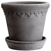 Copenhagen kruka från BERGS POTTER med en rustik, handgjord design i högkvalitativ, italiensk lera med en karakteristisk, dekorativ kant, oglaserad yta och en grå färg. Den har ett medföljande fat med en vattentät behandling i silikon. Välj mellan olika storlekar.
