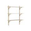 Hyllans design definieras av de bågformade träkonsolerna som ger ett distinkt och igenkännbart uttryck. Denna modell är 90 cm bred och har tre hyllplan, tillverkad i ask eller ek med valbara beslag i mässing eller aluminium, vilket gör den lättplacerad i många miljöer.