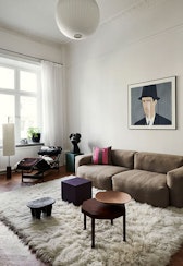 Lek med kontraster. En fluffig rya skapar dynamik i ett rum med hårda material och kantiga linjer. Varför inte testa en rund variant, för att mjuka upp rummet ytterligare?