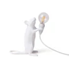 Mouse Lamp bordslampa från Seletti med en lekfull design i harts med en gullig, vit mus med en klar ljuskälla i handen. Lampan har en lång, vit USB-kabel för flexibilitet och en LED-ljuskälla med ett varmt ljus. Perfekt att placera i ett djupare fönster, på sidobordet eller på nattduksbordet.