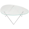 - Skulptural stålbas med organiskt formad glasskiva.