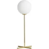 Runa bordslampa förenar en mjuk, rund lampskärm i opalglas med en slank metallbas i mässing eller krom. .