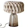 Den geometriska träskärmen filtrerar försiktigt ljuset och skapar ett varmt och stämningsfullt sken med en subtilt mönstrad effekt. Den transparenta glasbasen under skärmen ger en skulptural känsla samtidigt som den skapar en känsla av lätthet och balans i designen. Tillsammans bildar elementen en harmonisk kontrast mellan struktur och transparens.