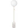 Torrano golvlampa från Globen Lighting med en modern formgivning med en vacker lampfot i sten, en rund, vit lampskärm i glas och detaljer i metall. Den har en lång, transparent sladd med en dragbrytare på glaskupan.