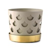 Trio Drop kruka från Klong med ett droppformat mönster med en minimalistisk, enfärgad design och en beige färg som harmoniskt smälter in i hemmet. Den har en rund form med en inre kruka och en yttre kruka och ett dekorativt fat i mässing med en lackerad, vattentålig finish. Kombinera olika modeller och färger för att skapa din egen fina mix. Tillgänglig i olika storlekar. Endast för inomhusbruk.