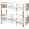 Wood Mini + Låg Våningssäng 68x162cm Vit/Ek är en söt liten våningsbarnsäng framtagen för just små rum. Sängen passar när barnet blivit för stort för spjälsängen men gärna sover med ett syskon nära. Komplettera gärna med passande madrass. Sängen finns i två utföranden: Vit och Vit/Ek. Obs! Stegen kan bara monteras på höger sida av sängen.